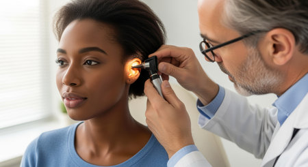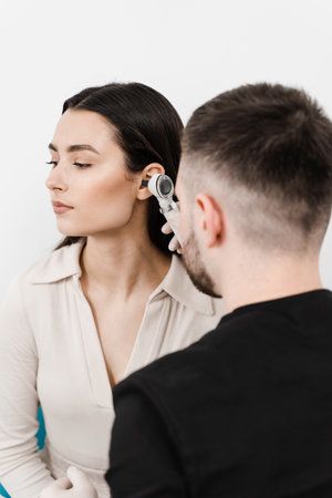 female patient undergoing ear examination by male doctor using otoscope in bright medical clinic during routine health checkup.