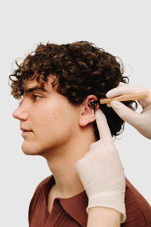 Otoplasty for changing the shape, position or size of the ears. Surgeon doctor examines ear of male patient before otoplasty surgery