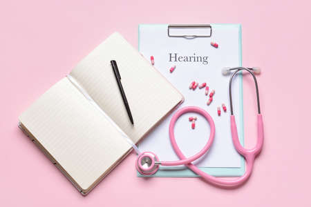 Clipboard with word HEARING, stethoscope and pills on color background