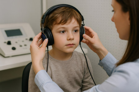 Doctor preparing a young boy for a hearing test by gently placing headphones on his head, ensuring a comfortable and accurate experience