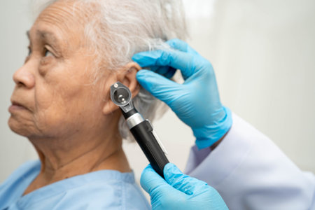 Otolaryngologist or ENT physician doctor examining senior patient ear with otoscope, hearing loss problem.