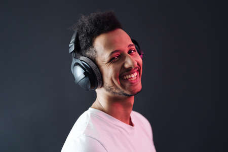 Smile Young African American man portrait wearing headphones and enjoy music over black Background with copy space. Red light reflection on face.