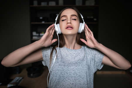 girl in headphones listens to music and dances, in belots shirt, soft focus, studio