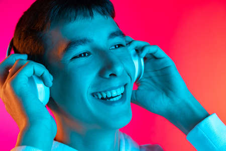 Listening to music. Caucasian mans portrait on purple studio background in multicolored neon light. Beautiful male model. Concept of human emotions, facial expression, sales, ad, fashion. Copyspace.