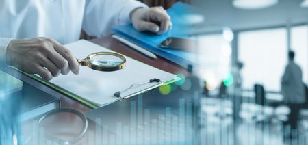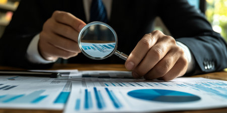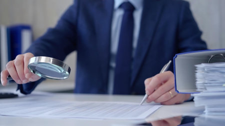An experienced professional examines financial statements with a magnifying glass, highlighting the crucial role of thorough audits in detecting potential fraud that might go unnoticed