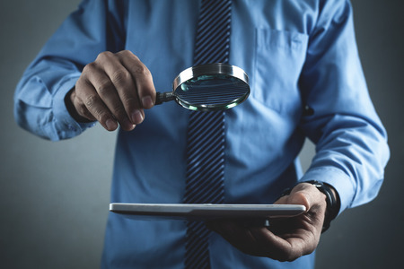 Man holding magnifying glass and tablet.