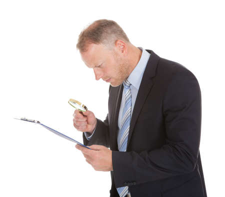 Mid adult businessman examining document on clipboard with magnifying glass over white
