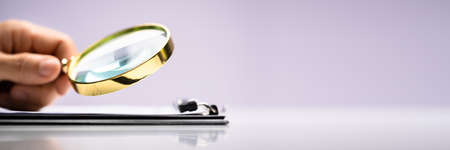 man hand magnifier with keyboard on desk
