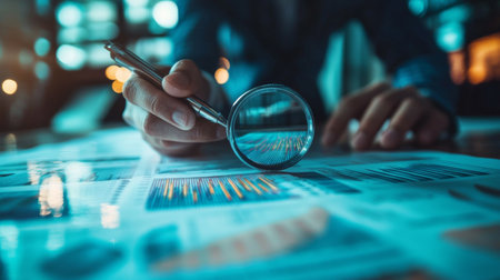 Close-up of a hand holding a magnifying glass over financial charts and data, symbolizing analysis, research, and business insights.