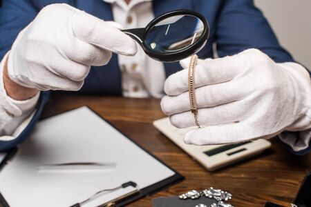 Cropped view of jewelry appraiser examining necklace with magnifying glass near calculator, clipboard and earnings on table isolated on grey