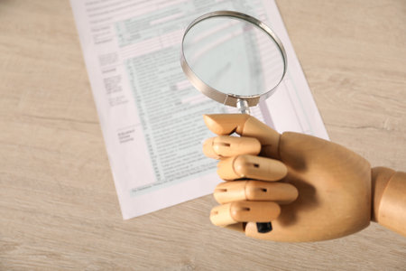 Mannequin hand with magnifying glass near document at wooden table, above view