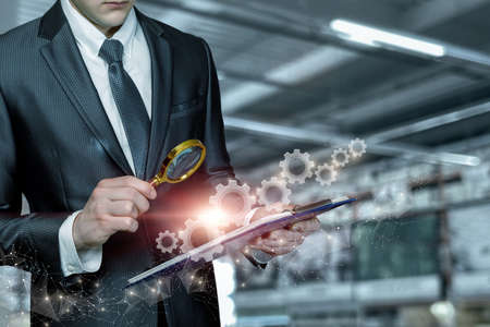 Business man examines mechanism business management on blurred background.