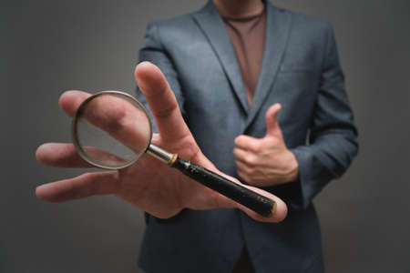 Magnifying glass in the businessman hand close up on gray background.