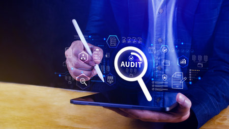 Audit business concept. Auditor. Compliance. Virtual screen technology.