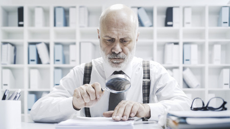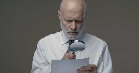 Senior corporate businessman reading paperwork using a magnifier, he is checking carefully an agreement