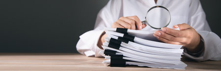 Businessman is carefully examining financial documents with a magnifying glass, highlighting the importance of thorough analysis in business. Audit and taxes