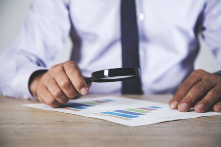 young businessman hand holding magnifier and document