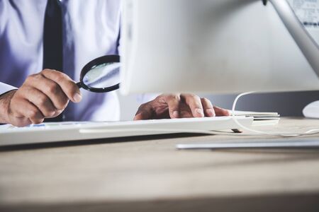 Businessman is working in his office, holding a magnifying glass to get a better look at the documents on his desk.