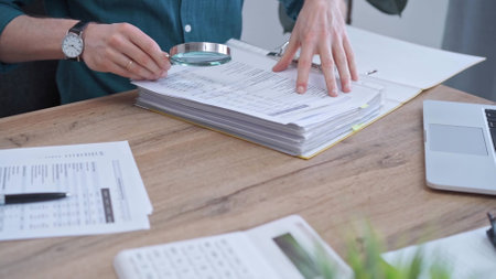 Businessman or auditor wearing green shirt is reviewing financial documents with magnifying glass. Business work process in bookkeeping office. Taxes
