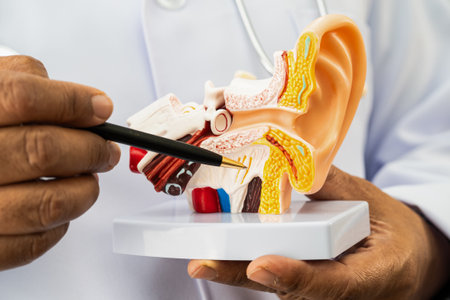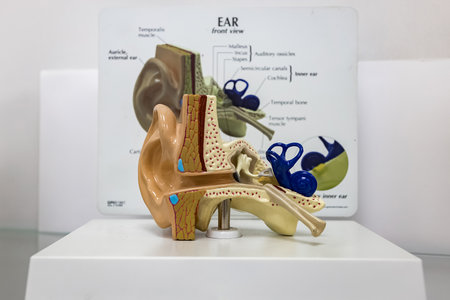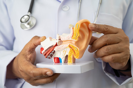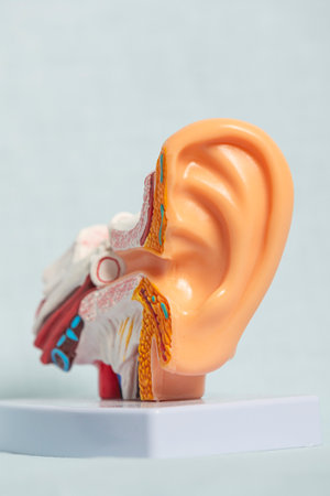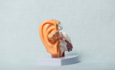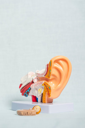 Close-up of anatomical model showcasing modern hearing aid fitted in ear, highlighting inner ear structure and technology assisting hearing loss
