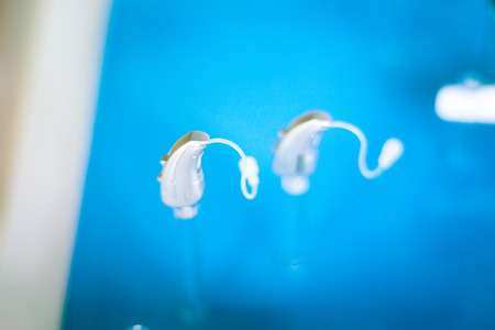 Modern high technology digital hearing aids in retail store shop window for the deaf and hard of hearing.