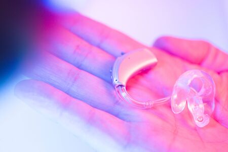 Modern digital hearing aid for deafness and deaf people.