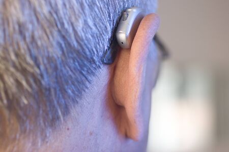 Caucasian white old aged man wearing modern digital hearing aid in ear with grey hair.
