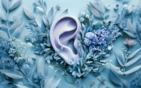3D render of human ear between a beautiful garden of flowers. Concept of healthy hearing, audition, deafness and femininity. World hearing day.