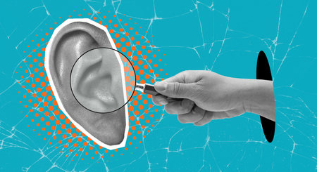 A hand holds a magnifying glass focused on a detailed illustration of an ear. The background is bright with orange dots, adding to the engaging visual.