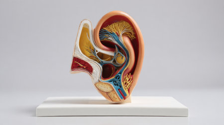 Detailed cross-section of a human ear model, illustrating inner ear anatomy and auditory pathways.