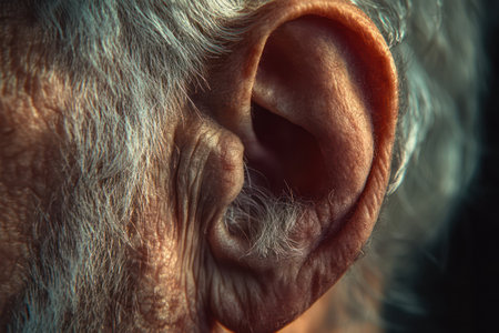 Macro photography of a mans ear highlighting the intricate details of the human auditory system, focusing on the concept of listening and sound perception