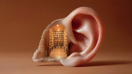Exploring the intricacies of sound perception through a close-up of an ear with sound wave graphics