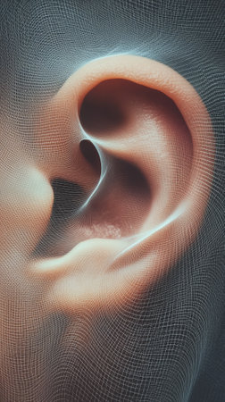 Digital grid enveloping a human ear, capturing the essence of listening to music and sound waves, illustrating the intersection of music technology and innovative sound design