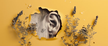 Artistic composition with doctor pointing at human ear filled with flowers, symbolizing hearing health and wellness. Contemporary art collage.