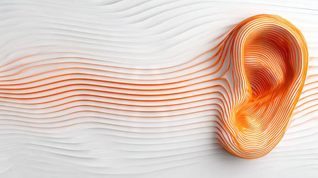 An abstract representation of a human ear rendered in a vibrant orange color with subtle highlights. The ear is positioned on a textured white background, with stylized wave patterns emanating from it. This imagery could be suitable for commercial and editorial contexts relating to hearing, sound, or health.