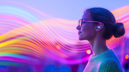 A woman is depicted with light waves emanating from her head, suggesting sound or energy. The composition features a shallow depth of field, with soft lighting and a dark background. This image could be used for various projects related to science, technology, or wellness, with applications in advertising or editorial design.