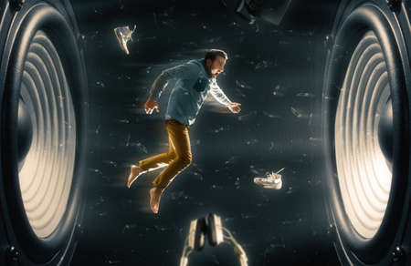 The sound wave from speakers throws out a screaming man, office chair and other subjects.