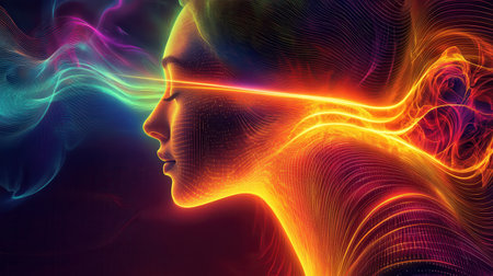 A woman's profile glows intensely against a dark backdrop, surrounded by vibrant, swirling colors. Ethereal patterns and light beams create a mystical atmosphere, evoking wonder and beauty.
