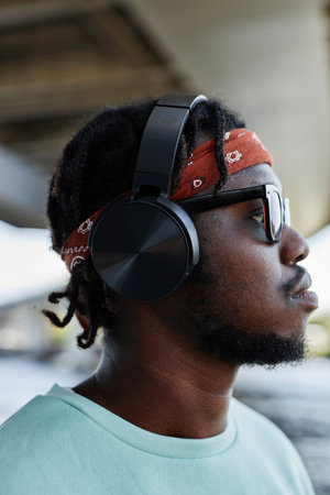 Profile view of young black man wearing headphones in urban city setting outdoors