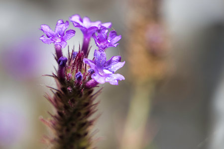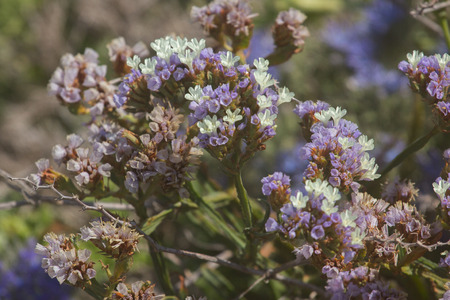 purple small flowers growing by the sea with green blurry background