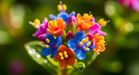 A vibrant macro photograph of a cluster of small, colorful flowers in shades of blue, pink, and orange, covered in tiny dewdrops. The shallow depth of field creates a beautiful bokeh effect in the green background, highlighting the delicate beauty of nature.