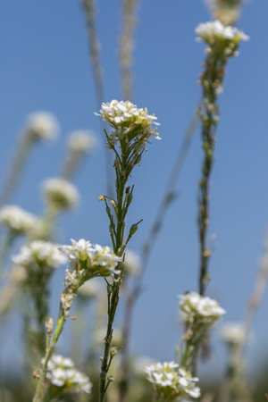Hoary false alyssum stands tall with clusters of small white flowers under a vibrant blue sky highlighting its slender green stalks in a summer landscape.