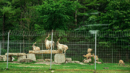 A group of mountain goats standing on rocks behind a fence in a lush green enclosure.