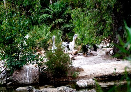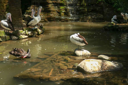 The zoo in the pond swimming geese, ducks and black swans. In the foreground goes to white Heron and the black ducks at the zoo
