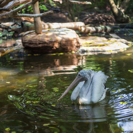 African water birds, Pink-backed Pelican (Pelecanus rufescens) swimming in the water and looking for food in the park habitats, on the bright sunlight and shade of the trees, close up wildlife photos.