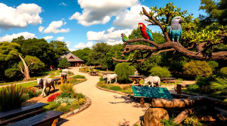 Wildlife and rainforest exotic tropical birds in a bird park.