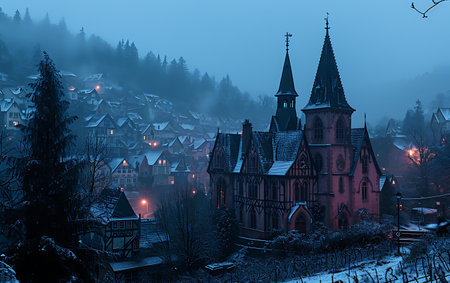 Village in the middle of a foggy valley with an old church