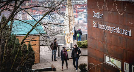 Freiburg, Germany - December 31, 2017: architectural detail and street atmosphere around the restaurant Dattler Schlossbergrestaurant the height of the city a winter day