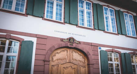 Basel, Switzerland - December 25, 2017: View of the facade of the Lyceum Gymnasium am Munschderblatz in the city center on a winter day. One of the most famous schools in Switzerland
