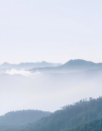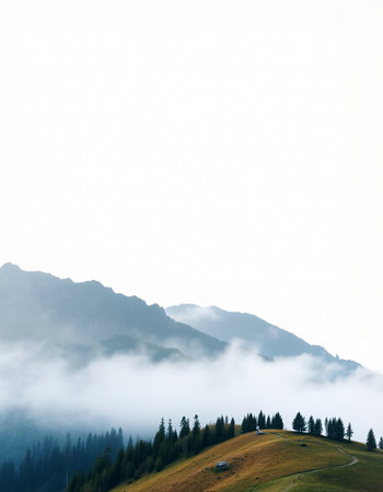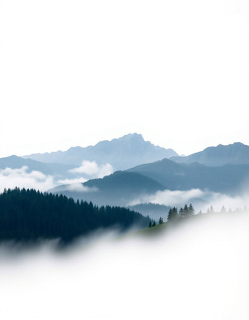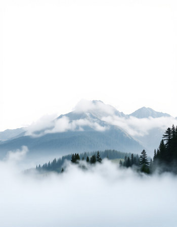 Discover a breathtaking mountain landscape shrouded in fog, with lush forests ascending into the clouds, creating a serene and tranquil atmosphere perfect for nature lovers.